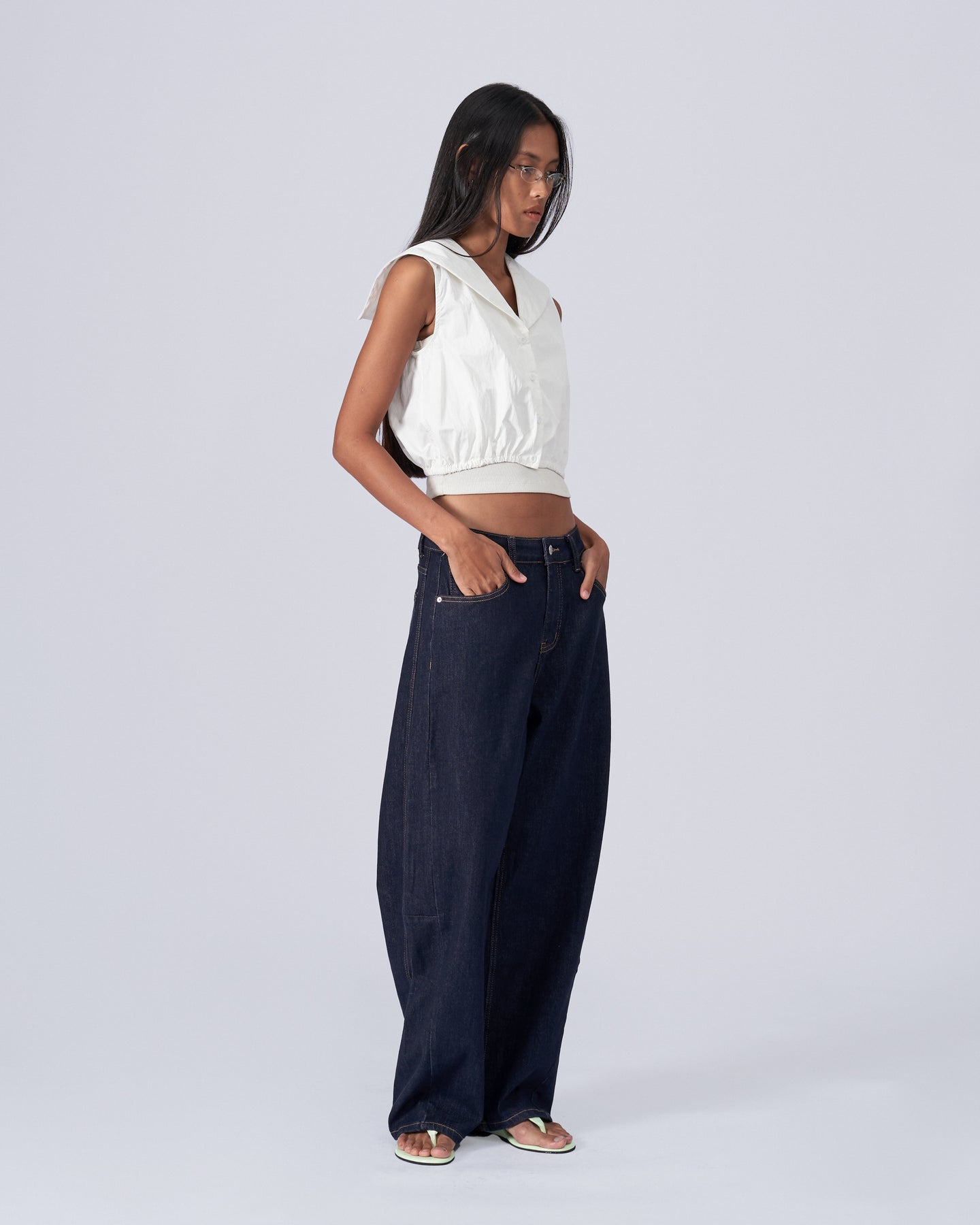• Sleeveless cropped shirt featuring