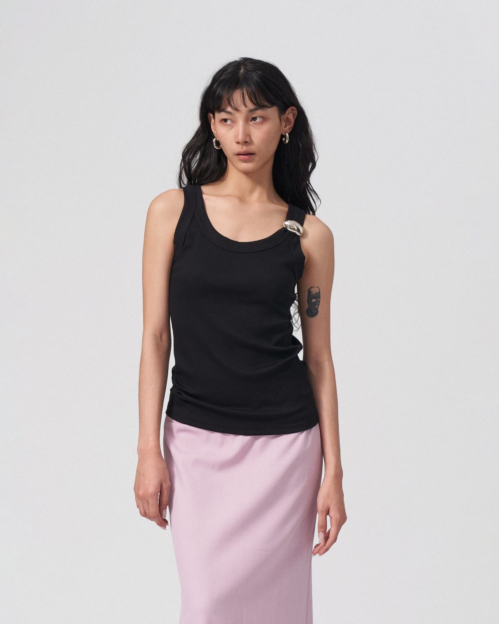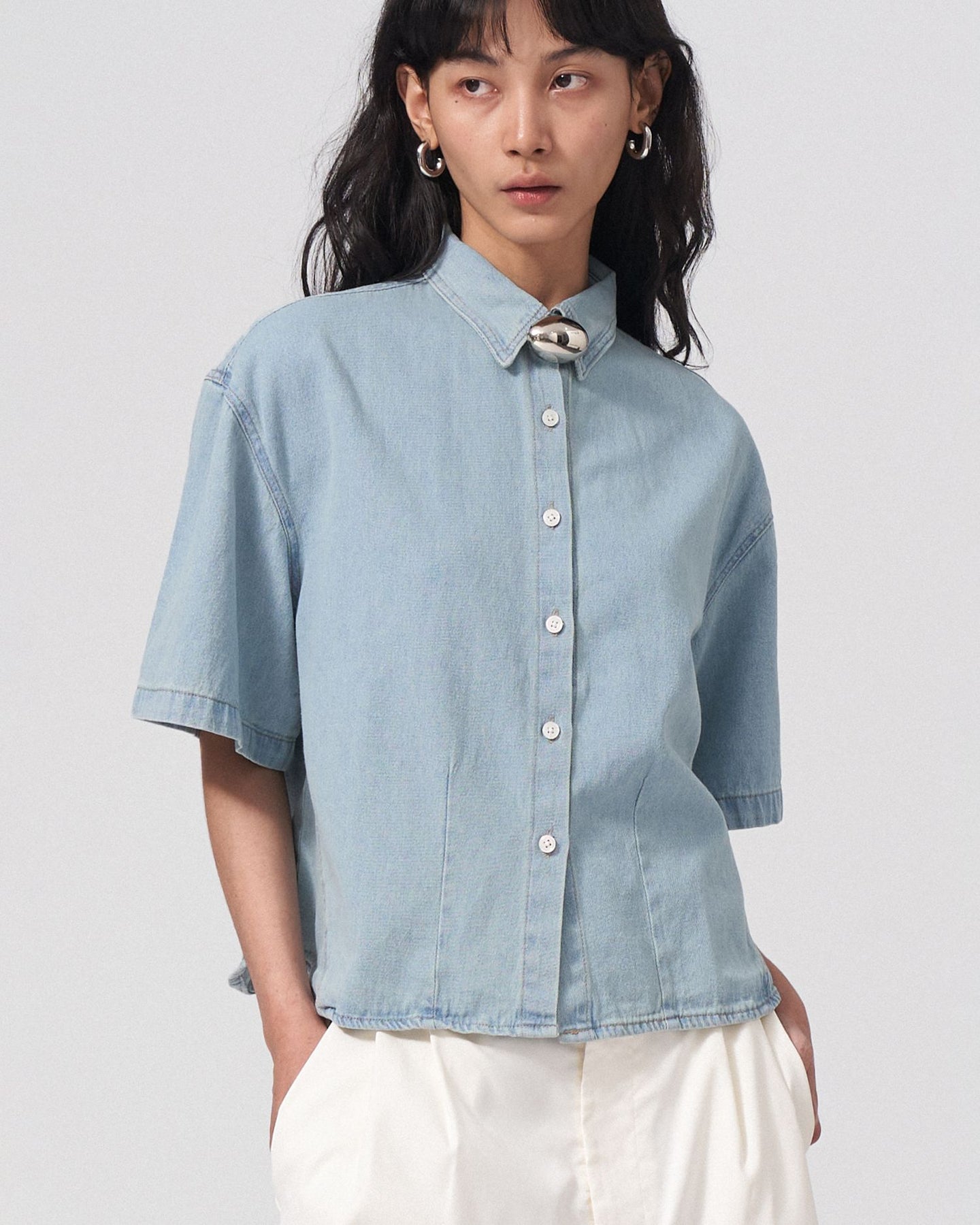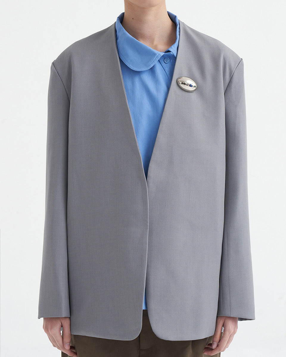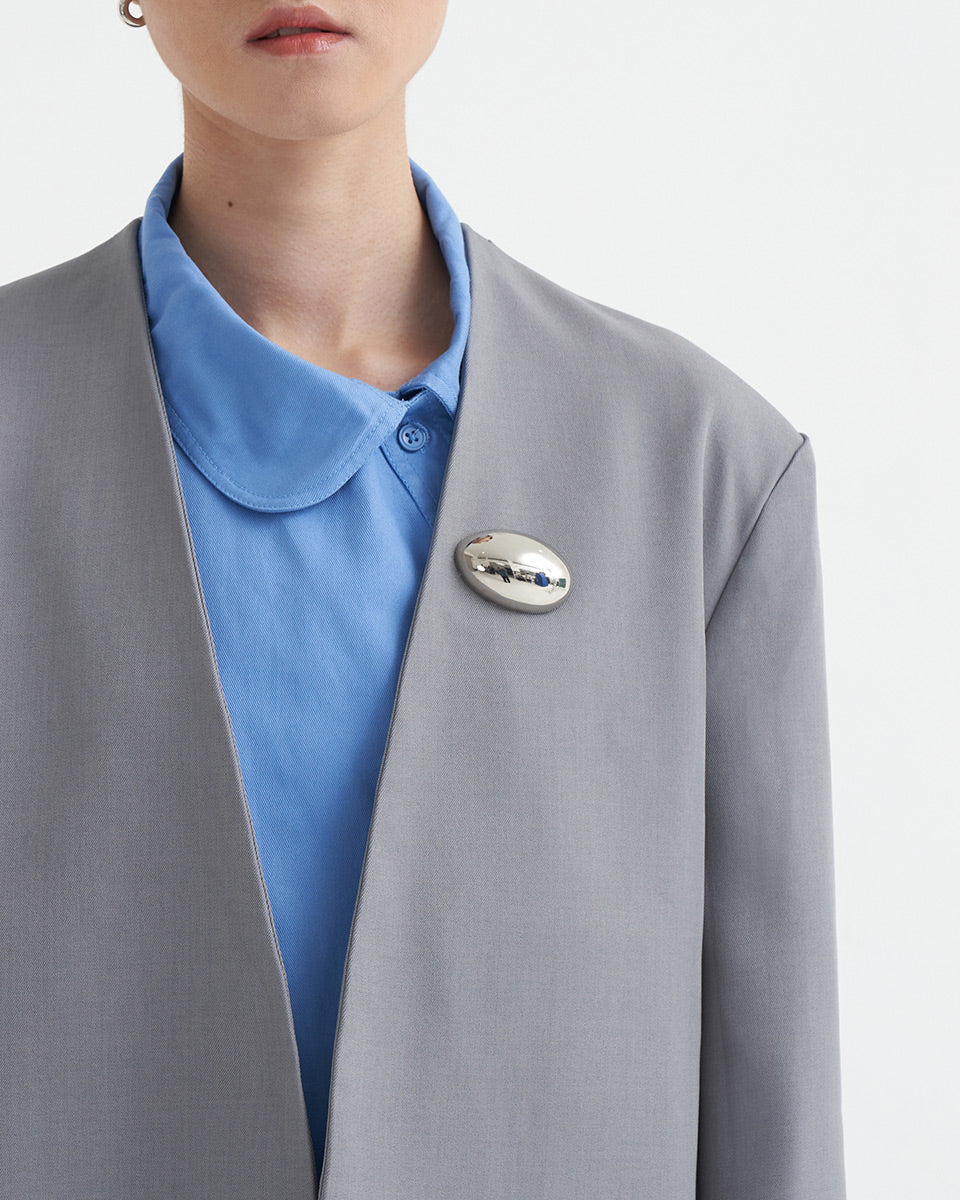 Make a bold statement with this sculptural metal brooch, featuring a sleek, polished finish and artistic detailing. Perfectly placed on a blazer or coat, it adds a touch of modern sophistication to any outfit.