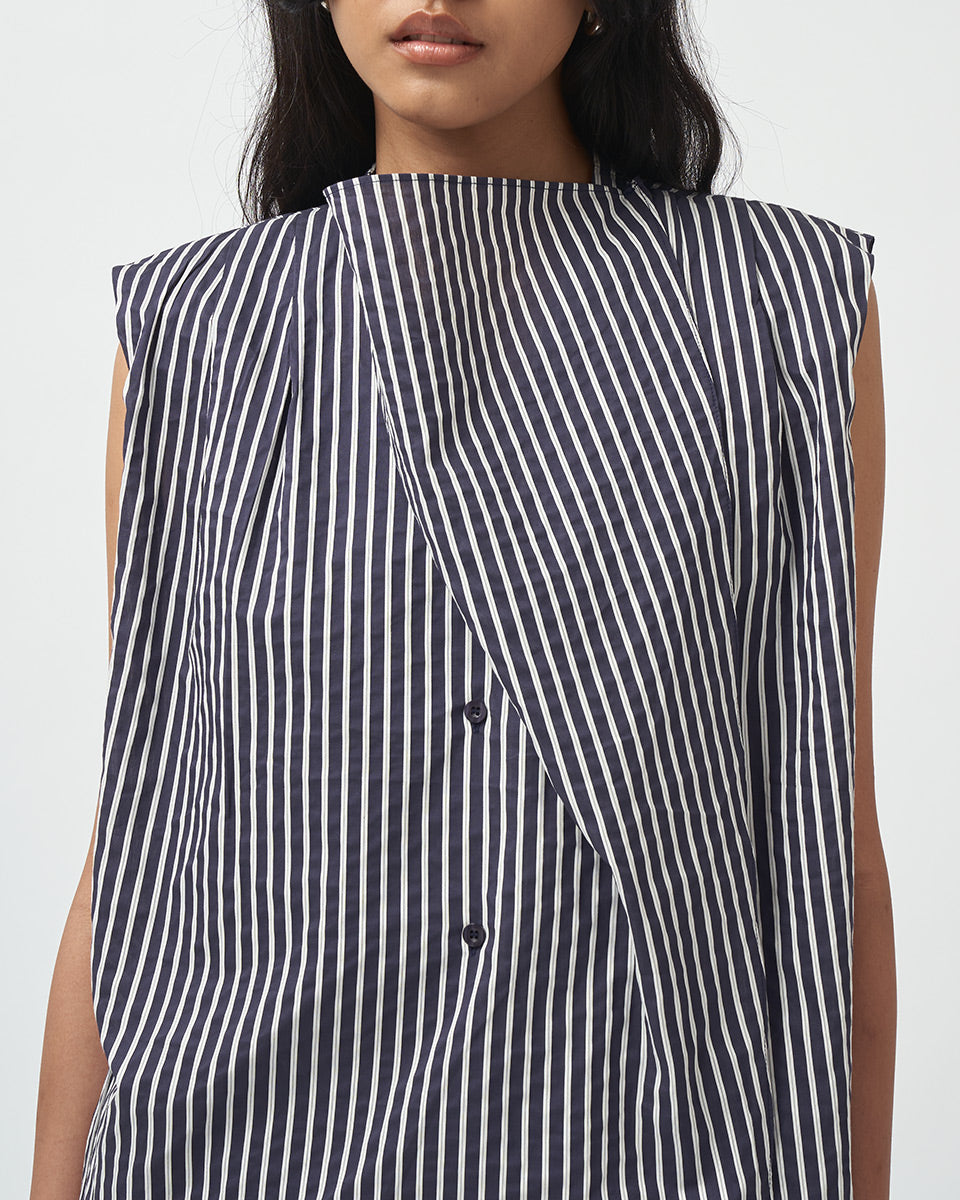 • Front button opening with extended fabric to create drape detail