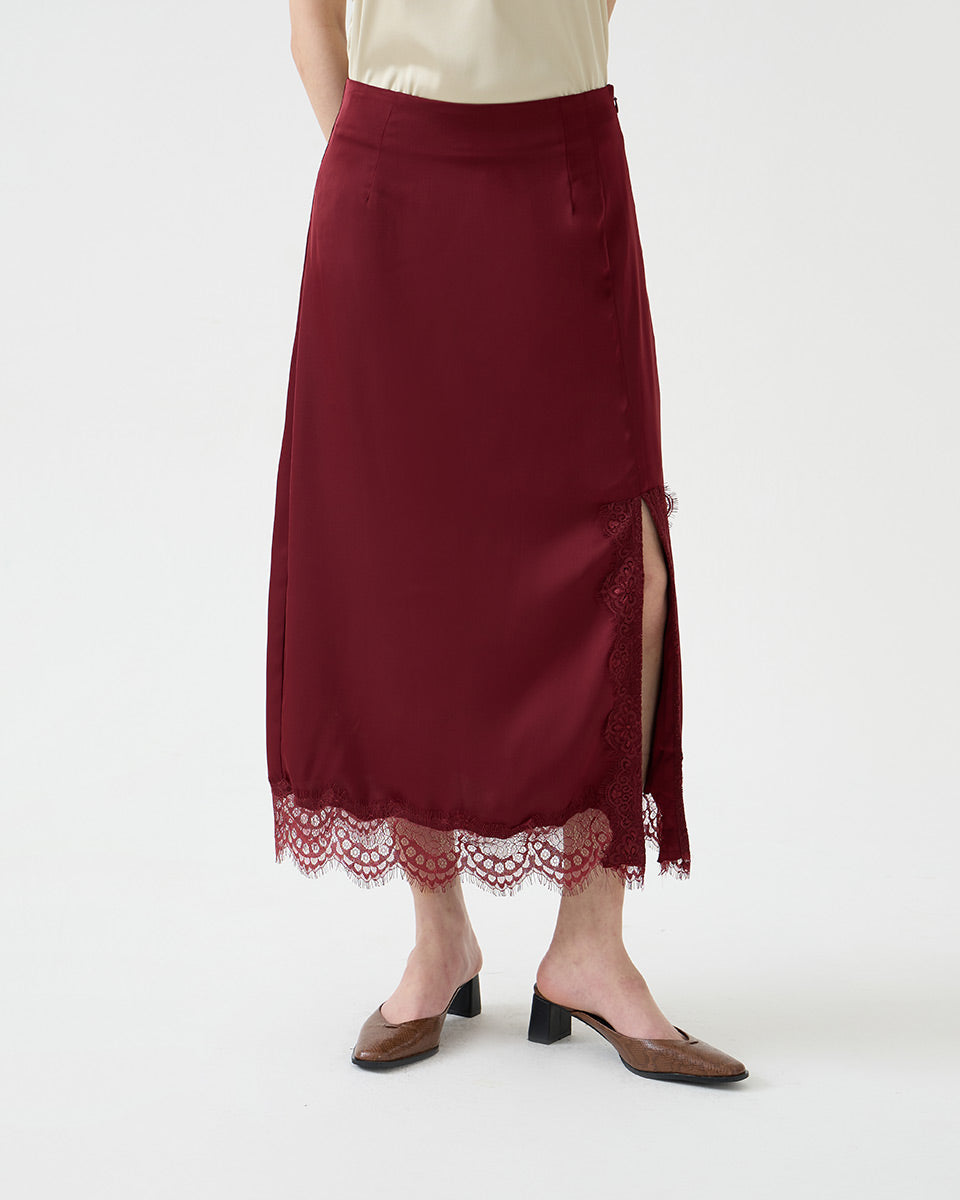 MINNA SKIRT is a high-waisted bias cut satin maxi skirt designed to create a graceful and feminine silhouette. The bias-cut creates a soft, flowing fabric that follows the curves of the body, while lace trimming on the hemline adds an elegant touch. Detail side slit opening with lace trimming provides a feminine accent as well as comfort when moving. Equipped with side zipper opening with hook & eye, this skirt remains neat and easy to wear.